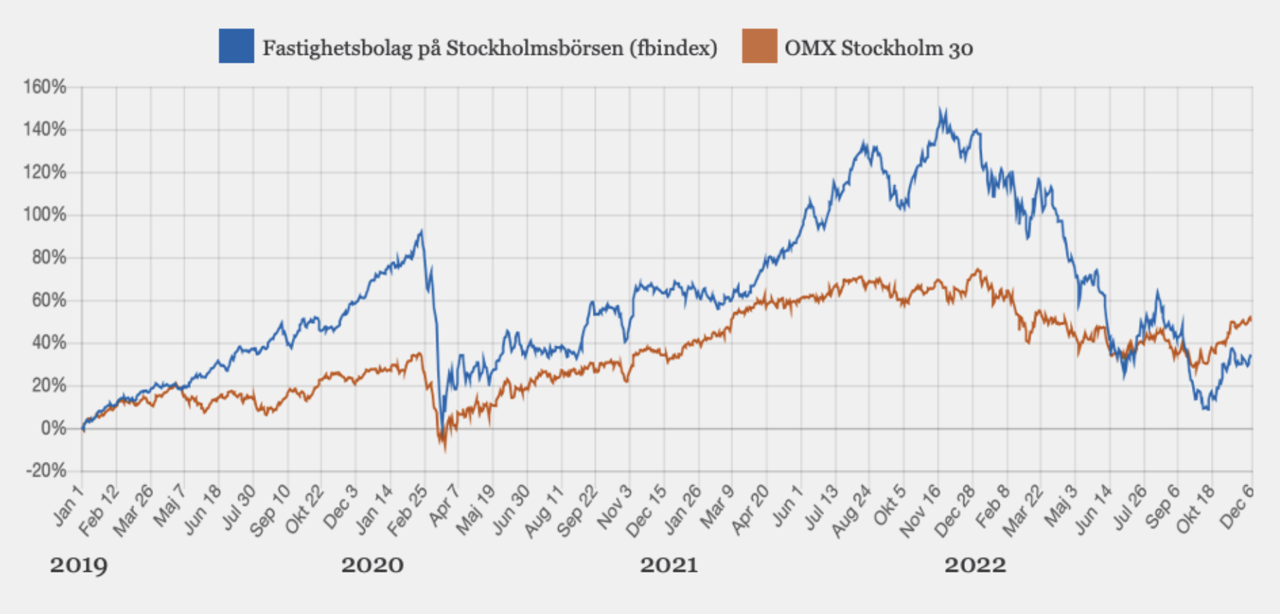 Aktiemarknadens reaktionKorrigeringen på börsen har varit rimlig i det stora hela givet det drastiskt förändrade omvärldsläget i kombination med det faktum att fastighetsbolagen innan sentimentskiftet låg på historiskt höga värderingar och tillväxtpremier. Däremot har vissa påverkats mer än rimligt – bolagen dras ibland över samma kam trots verksamhet i olika subsektorer eller olika finansiella förutsättningar.